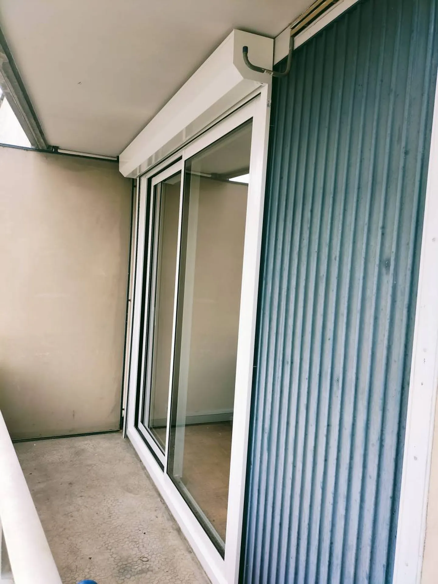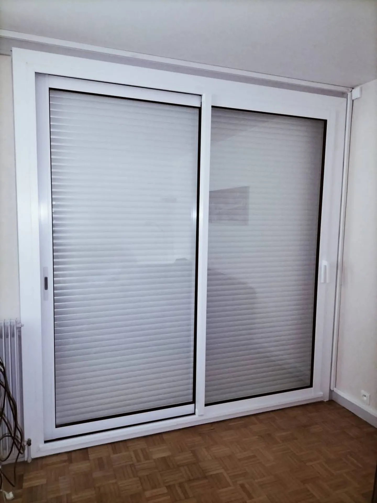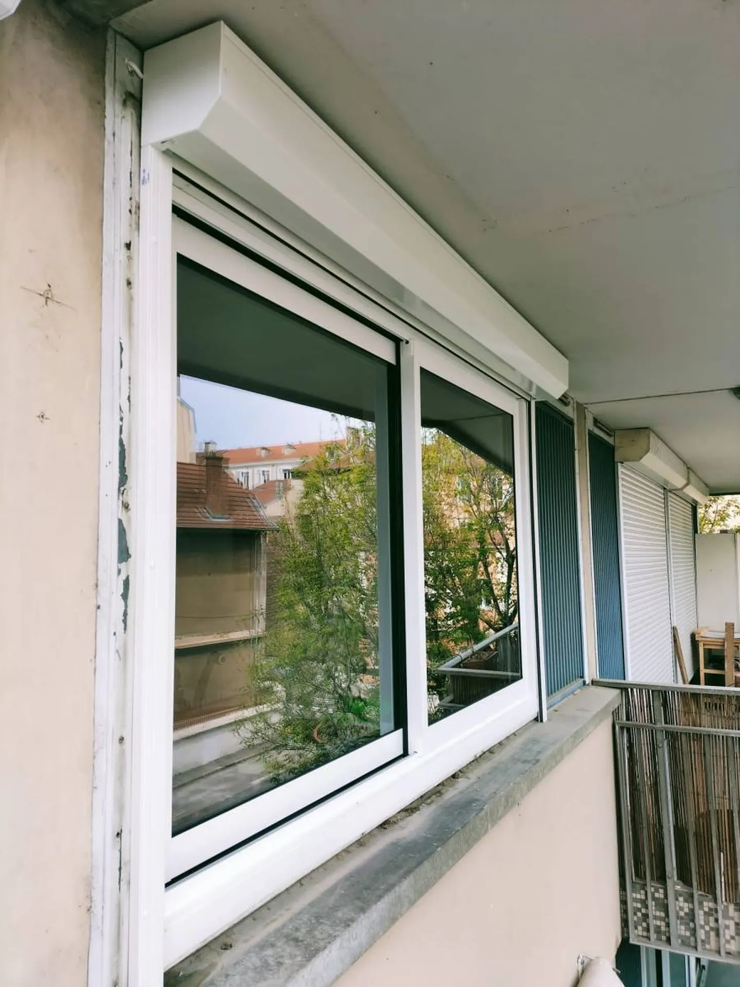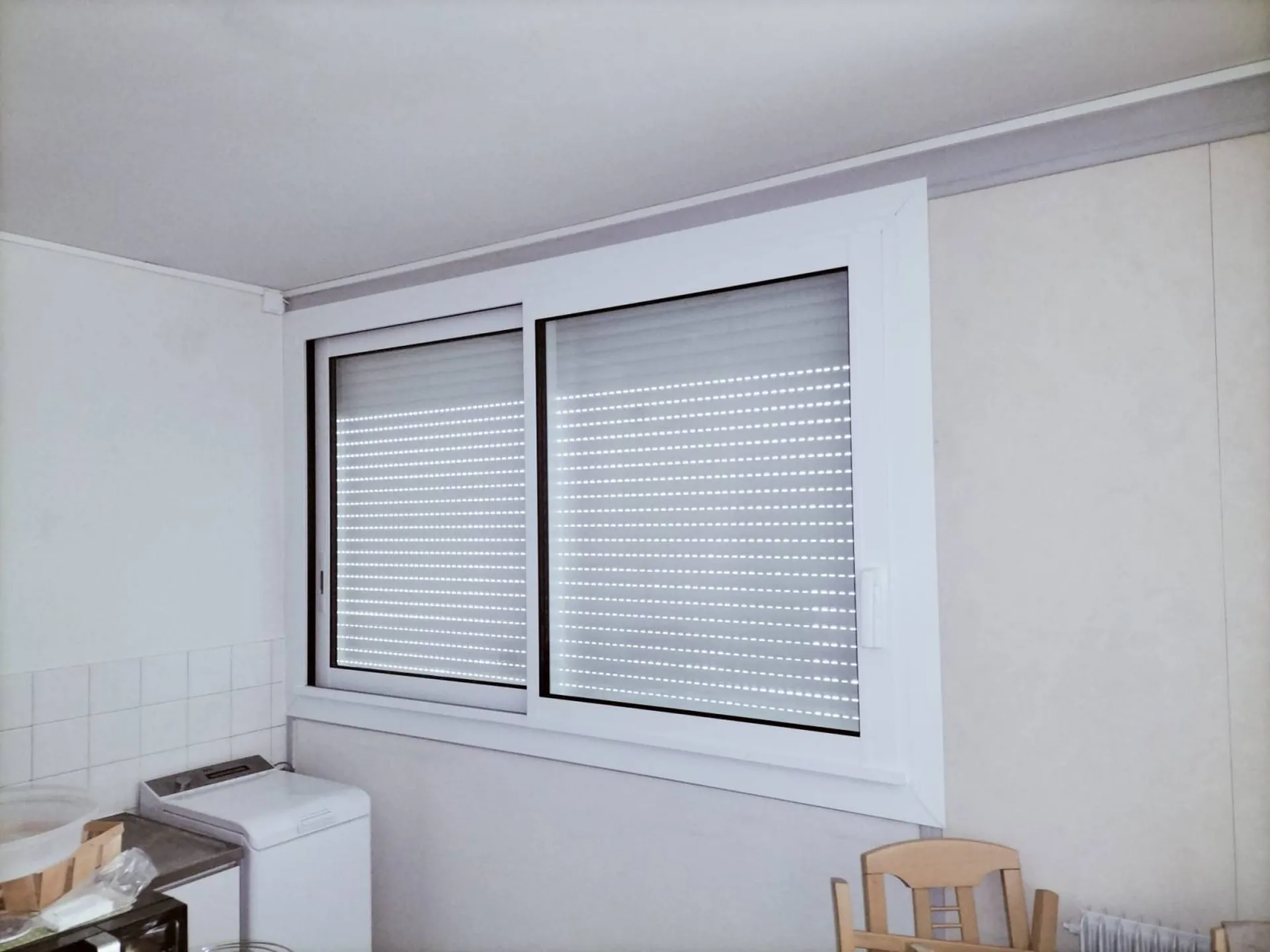 fenêtres aluminium double vitrage. Un volet roulant à coffre pan coupé blanc ral 9010 à commande électrique radio est installé au salon, avec un branchement électrique effectué par nos soins.